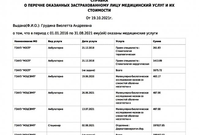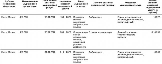 В регионах ситуация ничем не лучше. «Мы с супругой посетили раздел „сведения об оказанных медицинских услугах“ ради интереса и обнаружили много интересного, — рассказывает The Insider Иван Берегов из Санкт-Петербурга. — Жене приписали несколько визитов врача, проведенную диспансеризацию и даже какое-то обследование. У меня скромнее — один лишний визит и несуществовавшая диспансеризация. Самое смешное то, что мы проходили эту якобы диспансеризацию, сидя дома на карантине и болея коронавирусом. Кстати, диспансеризация — это не только посещение множества врачей, но и флюорография с анализами крови».