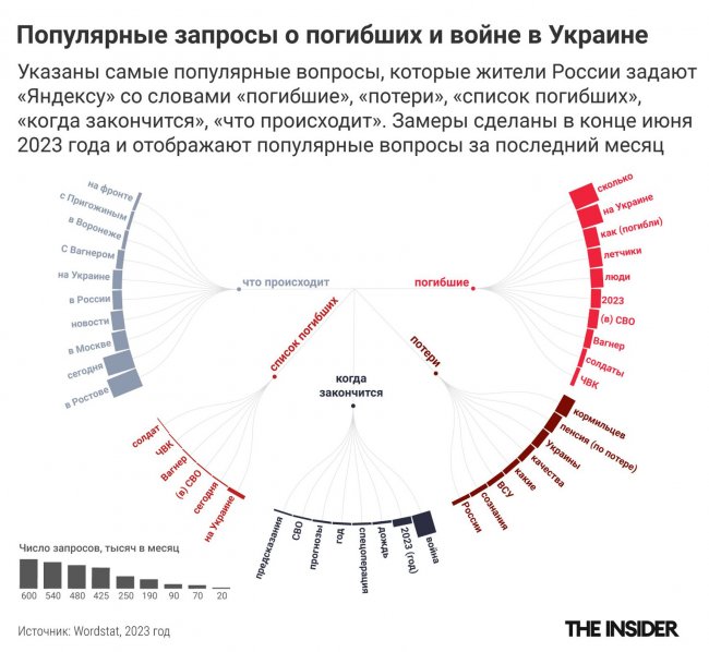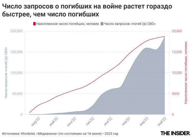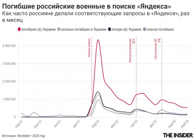 С конца августа, когда началось контрнаступление ВСУ в Херсонской области, и до его окончания в ноябре списки погибших искали очень активно. Новая волна поисков началась в январе, когда Россия начала собственное наступление — оно закончилось взятием Бахмута, но сопровождалось очень большими потерями, в том числе и на других направлениях — например, под Угледаром, где, по утверждениям украинских командиров, была (в очередной раз) разбита 155-я бригада морской пехоты Тихоокеанского флота. В начале мая 2023 года активность россиян, спрашивающих в «Яндексе» о списках погибших, начала расти. Чаще всего такие списки ищут в Псковской и Кировской областях, Саратове, Улан-Удэ и Чите.