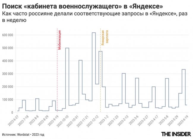 Еще один интересный запрос в «Яндексе» — «личный кабинет военнослужащего». Личный кабинет создается для всех, кто подписал контракт с Минобороны РФ, даже на короткий срок (не подписавшие контракт этого делать не могут). Десятого или одиннадцатого числа каждого месяца до мобилизации в сентябре 2022 года его искали около 100 тысяч человек — это число не менялось с началом войны, то есть было одинаковым как до войны, так и после 24 февраля 2022-го. В «личном кабинете» военные узнают, какое жалованье им начислили в прошедшем месяце. Мы обнаружили, что с октября 2022 года этот сайт стали искать 400–600 тысяч человек в месяц (позже это число уменьшилось до 200–300 тысяч человек в месяц, очевидно, многие просто перестали использовать поисковик для того, чтобы открывать сайт). Всплеск числа запросов «личного кабинета», видимо, связан с мобилизацией, когда многие новобранцы только начали пользоваться им: первый крупный пик приходится на середину октября — месяца, когда мобилизованным причиталась первая зарплата (хотя получить ее до сих пор удается далеко не всем). В среднем в «день зарплаты» искать «личный кабинет» после мобилизации стали на 300–400 тысяч человек больше. Это может примерно указывать на число новых рекрутированных (или их родственников, которые проверяют наличие выплат, пока военный находится без связи на фронте).