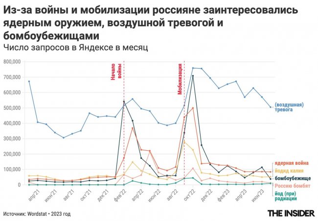 Рост тревоги неудивителен: с самого начала войны россияне ждут ядерной войны, ищут информацию о бомбоубежищах и о том, как йод помогает от радиации. У всех таких запросов пики повышенного интереса приходятся именно на даты начала обстрелов Украины и объявление мобилизации.