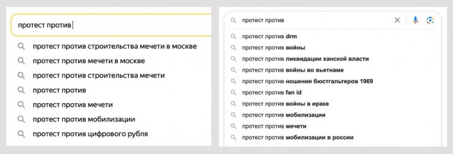 Примеры поисковых подсказок Яндекса и Google по словосочетанию «протест против»