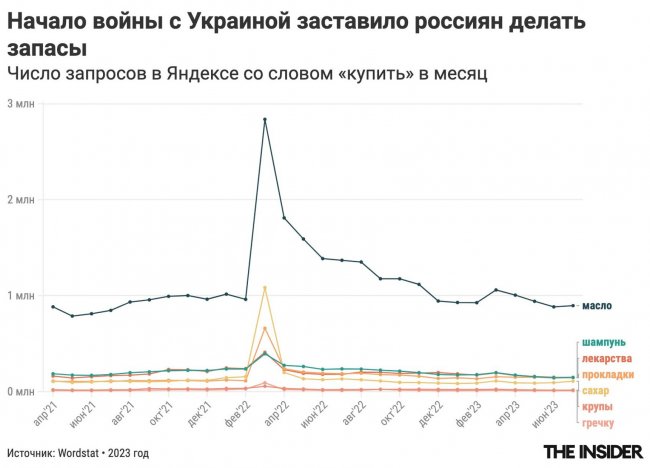 Начало войны в 2022 году, судя по поисковым запросам, резко изменило потребление россиян. Это отмечали и маркетологи. Специалисты «Ромир» через месяц после начала боевых действий указывали, что две трети жителей страны оценивали происходящее как кризис. Россияне ждали ухудшения ситуации и запасались продуктами: маслом, сахаром, тушенкой, макаронами и крупами. Масло, судя по поисковым запросам, пользовалось повышенным спросом до самого конца года, а интерес к другим товарам уже к маю вернулся в норму. Эти данные согласуются с Росстатом. По данным ведомства, подобные пики были и в марте 2020 года, когда начался ковидный карантин.