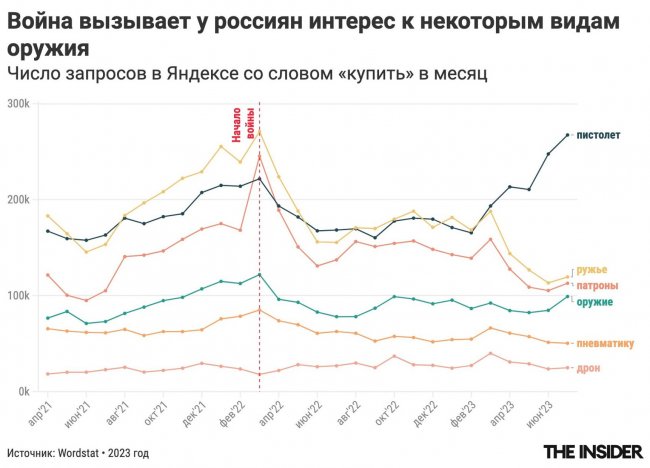 В это же время на пике популярности оказались патроны и ружья. Однако потом их перестали искать так активно. Хотя всплеск числа запросов «купить патроны» наблюдался и в марте 2023 года.