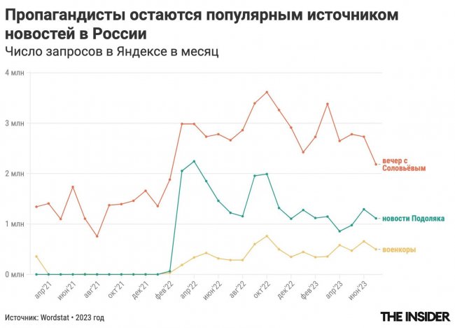 Самыми популярными источниками информации о войне при этом являются передача Владимира Соловьева, Telegram-каналы Юрия Подоляки и «военкоров».