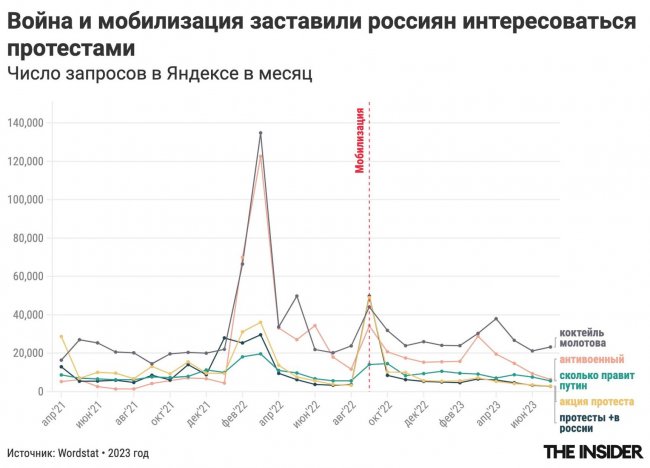 Интерес ко всему протестному падал прямо пропорционально росту числа уголовных дел за «дискредитацию ВС РФ». В марте и апреле 2023 года число поисковых запросов снова стало расти — и дело не только в том, что россияне искали протесты во Франции, Грузии и Израиле. Об этом можно судить по тому, что одновременно все чаще ищут слова «антивоенный» и снова тот же «коктейль Молотова». Однако чем ближе к лету, тем меньше россиян интересовала протестная активность.