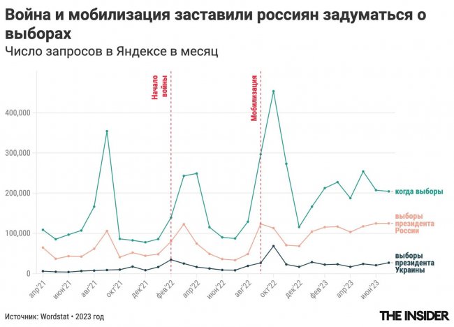 И мобилизация, и начало войны вызвали интерес к теме выборов. Обычно россияне спрашивают у Яндекса «когда выборы?» в сентябре — перед единым днем голосования. Однако в 2022 году почти такой же пик интереса пришелся на март и апрель — информацию о выборах искали почти миллион раз. Интересовались именно выборами президента России. С января 2023 года этот запрос не перестает быть одним из самых популярных, интерес к нему не спадает.