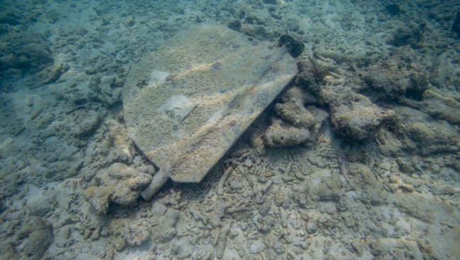 Фрагмент затонувшего судна в груде обесцвеченных мертвых кораллов на коралловом рифе в Ки-Уэст, штат Флорида