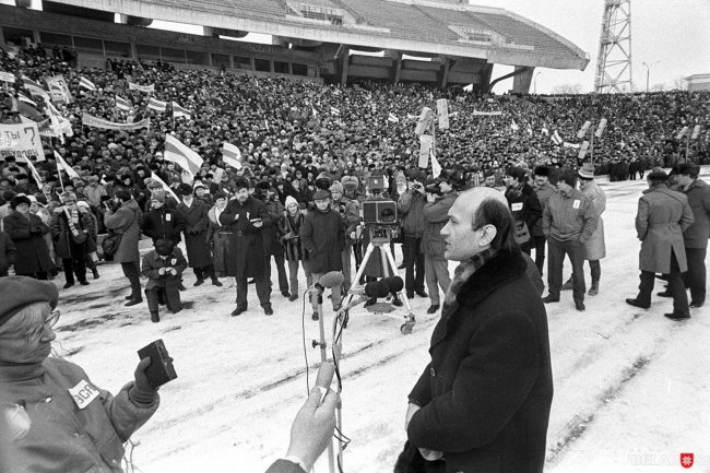 В 1989 году митинг на стадионе "Динамо" стал первой современной массовой демонстрацией белорусской национальной символики – бело-красно-белых флагов и герба «Пагоня».