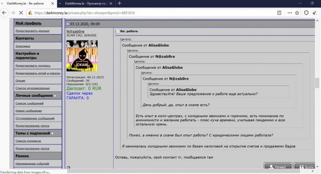 «Человек, который общается со всеми на форуме и набирает команду – скорее всего, организатор колл-центров, который берет деньги как раз за набор и собеседование сотрудников. Я знаю такие примеры, – рассказывает The Insider один из источников, сталкивавшийся с работой колл-центров в даркнете. – На работу в скам <мошенническая схема - The Insider> берут не просто людей с улицы, которые первый день в даркнете. Отбирают тех, кто уже работал в таких колл-центрах, лучше даже с психологическим образованием, у кого есть понимание, как обеспечить анонимность и кто не боится засветить свой голос».