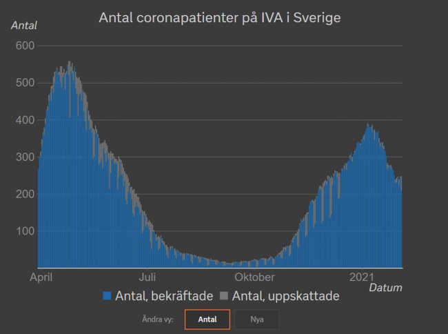 На официальном уровне основной целью шведской стратегии было провозглашено не полное прекращение пандемии (это было объявлено нереалистичным), а защита самых уязвимых групп риска и пресловутое «сглаживание кривой» - то есть снижение скорости распространения инфекции, чтобы дать службам здравоохранения возможность справиться с притоком пациентов. Количество мест в отделениях интенсивной терапии было очень быстро удвоено и к середине апреля превысило тысячу. В Стокгольмcком выставочном центре Stockholmsmässan была в срочном порядке оборудована экспресс-больница на 600 койко-мест (которая, впрочем, так и не была задействована), в Гётеборге шведская армия развернула полевой палаточный госпиталь, но и он принял лишь очень ограниченное количество пациентов, большую часть времени простоял пустым и в августе закрылся. В целом система здравоохранения справилась с весенним пиком пандемии – загруженность отделений интенсивной терапии не превысила 80%. Количество больных ковидом в интенсиве достигло пика – 558 пациентов – 25 апреля, после чего быстро пошло на убыль.