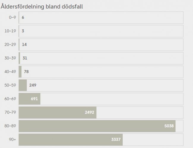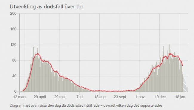 По состоянию на 4 февраля в Швеции было зафиксировано 12028 смертей с ковидом. В эту статистику попадают все, умершие в течение 30 дней после того, как у них был обнаружен коронавирус, вне зависимости от причины смерти. Исследование журналов пациентов в регионе Эстергётланд показало, что основной причиной смерти ковид был в 15-35% случаев, в 15% случаев не имел к причинам смерти никакого отношения, а в остальных случаях коронавирусная инфекция была фактором коморбидности при других хронических заболеваниях, ставших причиной смерти.