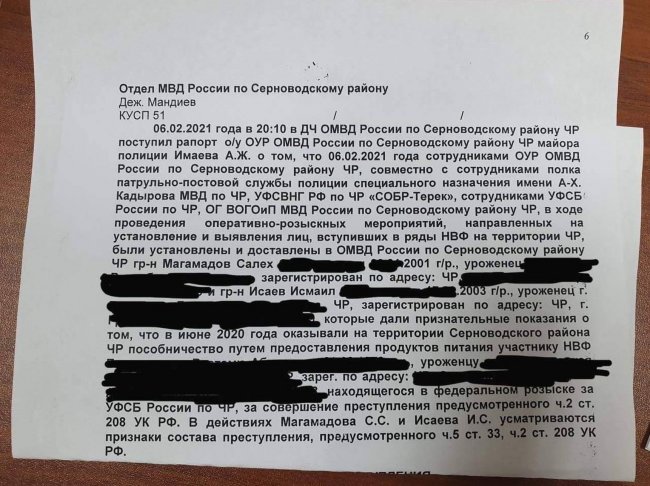 На этот раз парней повезли в Серноводское ОМВД. Адвоката в отделение не пустили. Когда отец вышел из здания и сказал, что написал отказ от услуг адвоката, уточнив, что его заставили это сделать. По словам отца, его ударили мокрым полотенцем по почкам и угрожали, также он говорил по видеосвязи с замглавы МВД Чеченской республики, который угрожал, что его покажут по всем чеченским каналам.