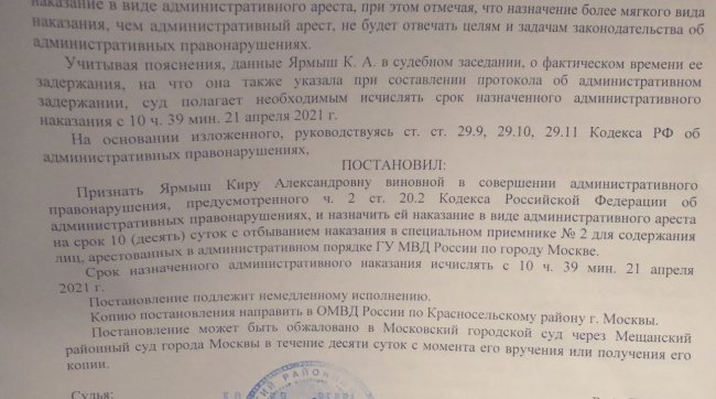Кира Ярмыш арестована на 10 суток, сообщила адвокат Вероника Полякова. Ранее Ярмыш доставили в Мещанский суд. Ее обвинили в организации митинга, хотя она уже 2,5 месяца не может пользоваться интернетом.
