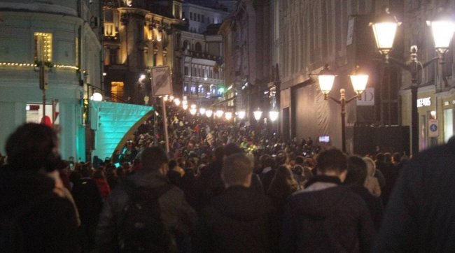 В Москве на Тверской все зажгли фонарики в телефонах.