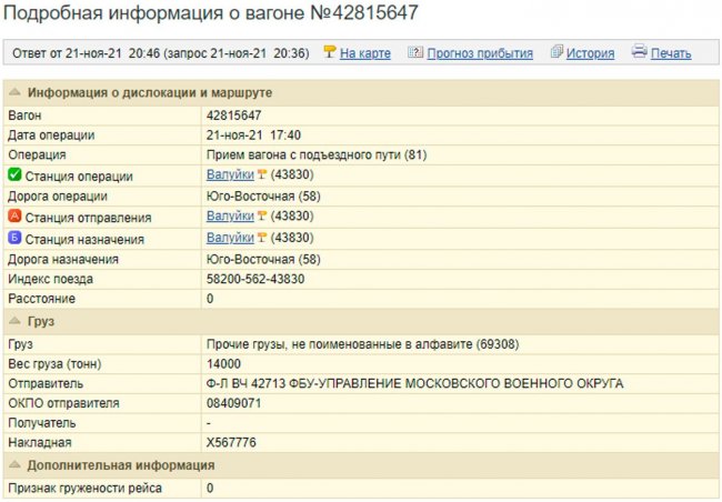 Так, 19 ноября на станции Мичуринск-Воронежский засняли следовавший в Масловку эшелон с боеприпасами, машинами химической разведки РХМ-6 и тяжелой огнеметной системой «Солнцепек». Исследователь Конрад Музыка предполагает, что он мог перевозить технику 20-го полка РХБЗ, который также входит в состав 1-й гвардейской танковой армии и дислоцируется в 10 км от станции Ильино — места отправления эшелона согласно справке сервиса GdeVagon.