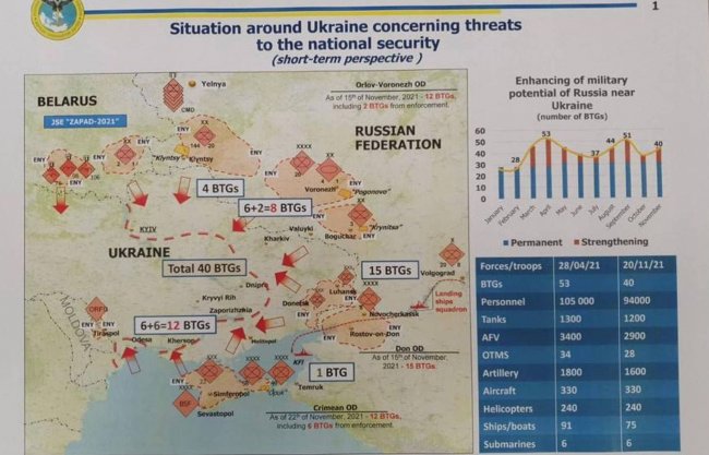 С начала ноября, когда западные СМИ стали сообщать о наращивании российской группировки у границы с Украиной, ситуация значительно изменилась. Американская и украинская разведка уже заявляют о подготовке вторжения на территории, подконтрольные украинским властям, которое должно, по их данным, начаться зимой. Глава военной разведки Украины Кирилл Буданов в интервью американскому изданию Military Times указывает на конец января — начало февраля как возможные даты начала операции. Ресурс также приводит украинскую карту сосредоточения российских сил.