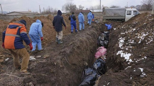 Братская могила на окраине Мариуполя. Как пишет "Униан", люди сбрасывают туда тела погибших, потому что не могут нормально их похоронить из-за обстрелов.