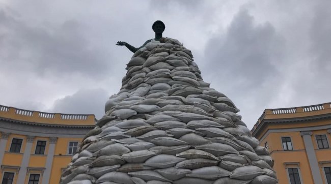 Одесса готовится к обороне. Один из символов города, памятник Дюку де Ришелье, обложен мешками с песком.