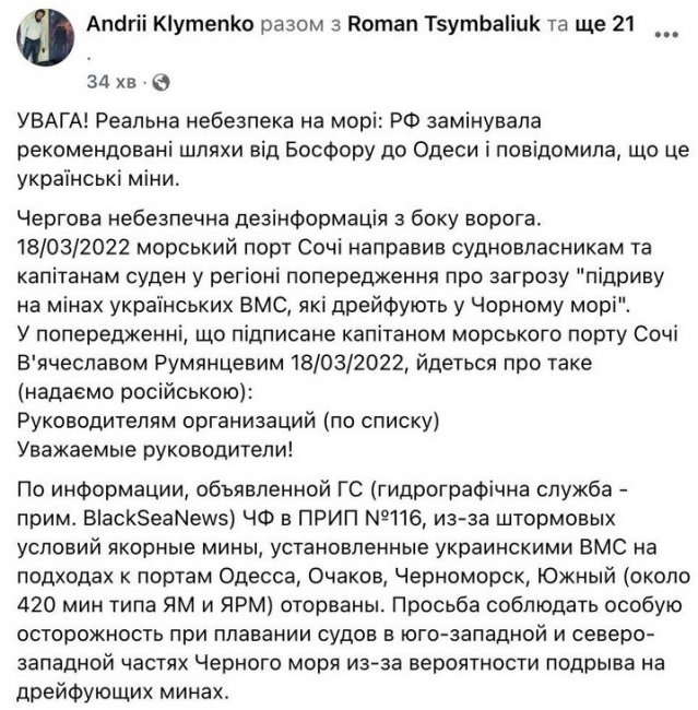 Россия заминировала пути от Босфора в Одессу и заявила, что это украинские мины, сообщил руководитель проекта «Института Черноморских стратегических исследований» Андрей Клименко.