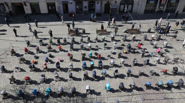 На площади во Львове поставили 109 пустых детских колясок – столько детей погибли в Украине с начала полномасштабного вторжения россии.