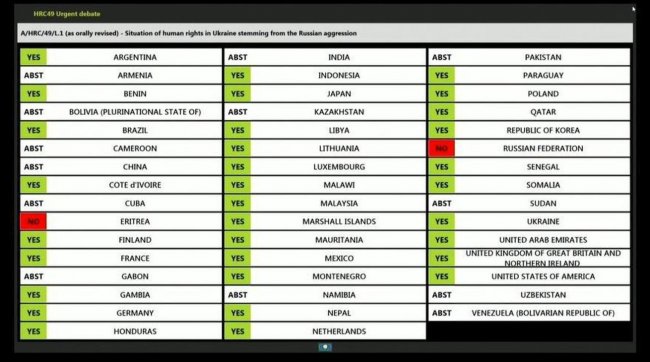Совет ООН по правам человека проголосовал за проведение расследования «в связи с агрессией России против Украины». «За» проголосовали 32 страны, «против» — две, 13 стран воздержались от голосования.