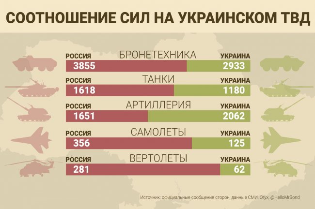 По данным справочника Международного института стратегических исследований (International Institute for Strategic Studies, IISS) Military Balance 2022 (оценка для ВС РФ доступна здесь, для ВСУ — здесь), перед нападением на Украину Россия обладала подавляющим преимуществом по всем видам обычных вооружений. Российская авиация насчитывала почти 1400 боевых самолетов против 125 самолетов у Украины и чуть меньше 500 ударных вертолетов против 42 украинских. Сухопутные войска превосходили украинцев в технике в 3–7 раз: 13 000 танков против 2100, 20 000 единиц бронетехники против 3000, 6000 артиллерийских систем против 2000. Военно-морские силы России и Украины некорректно сравнивать: по сути, украинский флот состоял из одного крупного надводного корабля против десятка в составе только Черноморского флота РФ (не говоря уже о подлодках, которых у Украины нет).