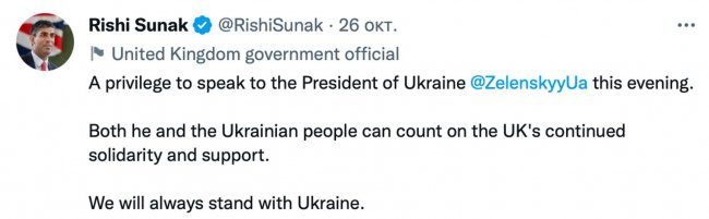 Владимир Зеленский тоже отметил, что у него был «замечательный разговор» с британским премьер-министром, что они договорились открыть новую главу отношений между двумя странами. С тех пор поддержка Украины упоминается в сообщениях Сунака ежедневно. Еще до своего вступления в должность премьер-министра Сунак обещал, что первый же его заграничный визит будет в Киев.
