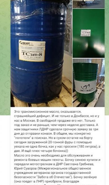 16 ноября опубликован благодарственный пост в Telegram-канале группы «Москва — Донбасс»: «В сухом остатке на борту сегодня загруженной 20-тонной фуры с помощью уехала не одна бочка, как у нас просили (180 литров), а две. И еще плюс четыре бочонка. Масло это очень необходимо для обслуживания и ремонта боевых машин пехоты», — говорится в посте. Опубликованы и фотографии бочек: синяя поедет в ДНР, зеленая — в ЛНР.