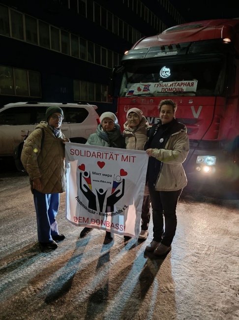 Слева направо: Людмила Чубакова, Елена Романенко, Сауле Иванова, Лиана Килинц VK.com 22 ноября «Москва — Донбасс» публикует сообщение о том, что «двадцатитонник» прибыл к месту назначения и разгружен на складе в Донецке «при финансовой поддержке» фонда «Мост мира». Персональная благодарность объявлена не только Лиане Килинц, но и всему руководству фонда — «нормальным немцам». На видео разгрузки «гуманитарной помощи для жертв войны» видны купленные ранее бочки с трансмиссионным маслом для боевых машин пехоты. Сама Килинц во «ВКонтакте» пишет, что был доставлен транспорт с «гуманитарной помощью».