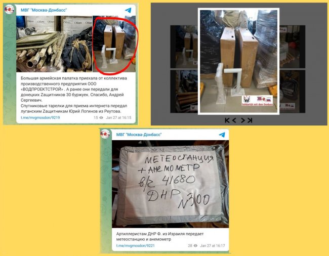 В конце января фонд Килинц помогал переправлять на Донбасс спутниковые тарелки для приема интернета, а также метеостанции и анемометры для артиллерии. А в феврале «Мост мира» оплатил и доставку антидронового ружья и дрона, которые отправились в казачий полк ЛНР.