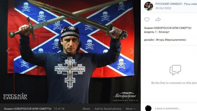 Грунской в одежде дизайн-студии «Русский символ». Лозунг — «Новороссия или смерть» VK.com