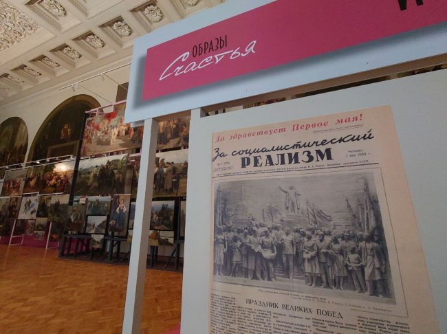 «Счастье» оформлено так, что сложно сразу понять — это очень жирный троллинг или организаторы абсолютно серьезны. Кажется, все-таки второй вариант. Имеется в виду послевоенное счастье от мира, и речь еще про Вторую мировую — главную войну российского патриотического мифа. На стендах ярко-розового цвета — учебные работы 50-х и 60-х годов прошлого века, в центре зала — репринты разворотов газеты «За социалистический реализм» с цитатами студентов: