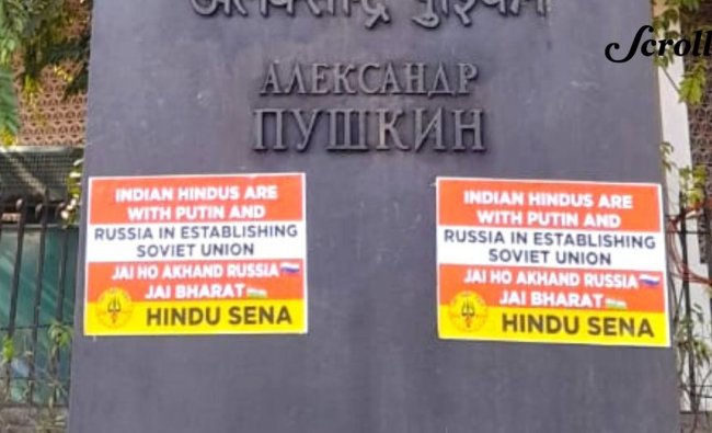 «Хинду Индии — с Путиным! Россия восстанавливает Советский Союз. Да здравствует несломленная Россия!» — такие плакаты появились на памятнике Александру Пушкину в Нью-Дели всего через несколько дней после начала вторжения России в Украину. Их установили представители ультранационалистического движения Hindu Sena («Армия индусов» или «Армия хинду»). Эта акция получила широкую огласку в Индии и вызвала резкую критику индийской оппозиции. Полиция сняла плакаты и назвала недопустимой порчу памятника. Однако к ответственности так никого и не привлекли, хотя сам глава Hindu Sena признал, что акция в поддержку Путина — это их рук дело.