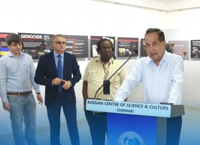 Индийский журналист и издатель Нарасимхан Рам выступает на открытии выставки «Обыкновенный нацизм» в Российском культурном центре в Ченнаи