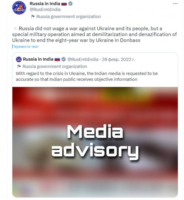 Впрочем, не все в Индии готовы слушать кремлевскую пропаганду. Посольство России в Индии в своем Twitter попыталось заставить индийские СМИ не использовать слово «война», а вместо этого называть ее «специальной военной операцией». Это замечание вызвало скандал — индийские пользователи Twitter в ответ высмеяли посольство.