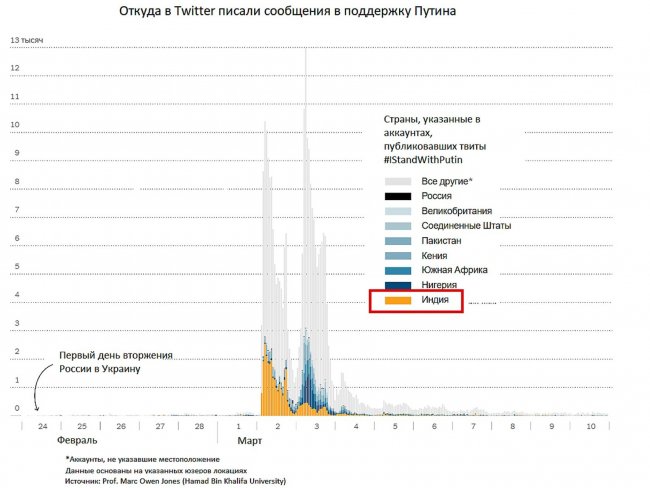 «Был резкий всплеск пророссийской активности 2 и 3 марта, затем резкое снижение, и потом они вернулись обратно к индийской политике и особенно не комментировали вторжение», — рассказывает директор CASM Карл Миллер.