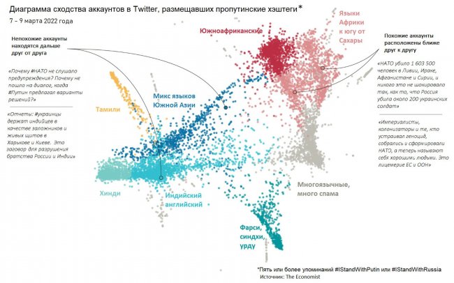 Во всех трех кластерах почти не было аккаунтов с большим количеством подписчиков. Тем не менее пророссийские твиты получали сотни и тысячи репостов. «В сети определенно есть признаки автоматизации, об этом свидетельствует переход к англоязычным сообщениям о вторжении, а затем возврат к хинди, — полагает Миллер. — Это точно скоординировано. Это может быть серия кампаний, связанных единой целью».