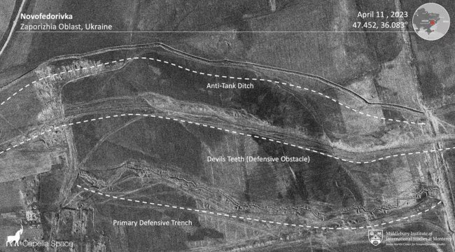 Спутниковый снимок российских оборонительных сооружений в Новофёдоровке (Запорожская область)