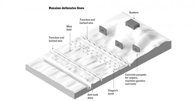 В то же время россиянам потребуется огромное количество ресурсов, чтобы поддерживать все эти траншеи, бетонные заграждения, опорные пункты, блиндажи в порядке, размещать там резервы, наладить связь и управление и так далее. Маловероятно, что все эти силы и средства изначально закладывались в планы.