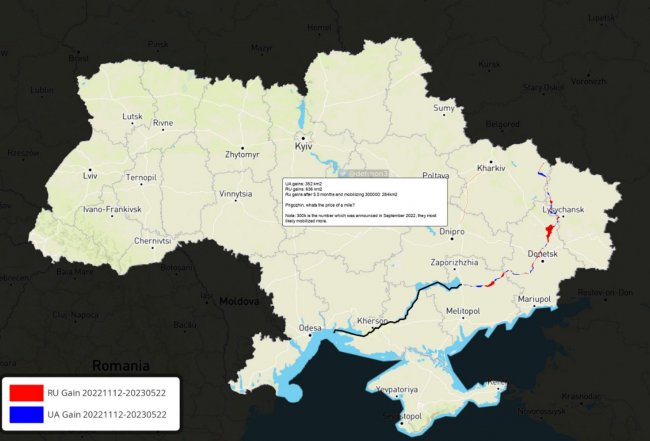 Итоги зимне-весенней кампании в Украине позволяют смело говорить о провале этих замыслов. Мобилизация не позволила качественно повысить боеспособность воюющей армии, скорее наоборот — общая степень оснащенности и подготовки даже снизилась. Если посмотреть на карту изменения линии фронта с ноября 2022 года до 20-х чисел мая 2023 года, то территориальное продвижение российских войск (выделено красным) выглядит просто смехотворным.