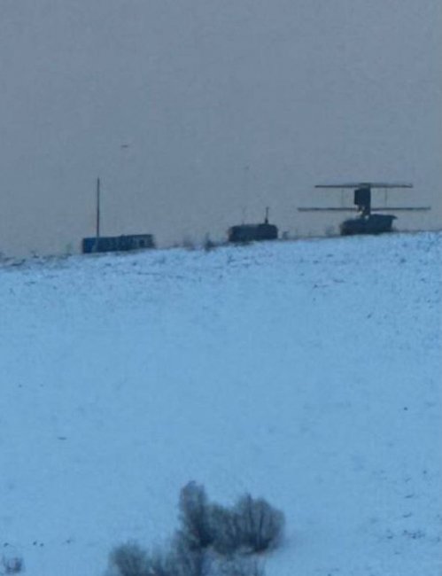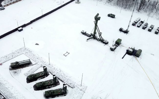 С-400 — зенитный ракетный комплекс дальнего и среднего радиуса действия. На опытных полях четыре пусковые установки находятся в рабочем положении. Также на площадке развернута многофункциональная РЛС 92Н6Е, она обнаруживает и сопровождает воздушные цели. Сначала ее установили на колесном шасси, а в конце февраля — на передвижной вышке 40В6М высотой около 25 метров. В центре площадки — всевысотная РЛС 96Л6Е, предназначенная для измерения координат аэродинамических целей: самолетов, вертолетов, БПЛА и ракет. Между двумя вышками — цистерны с топливом.