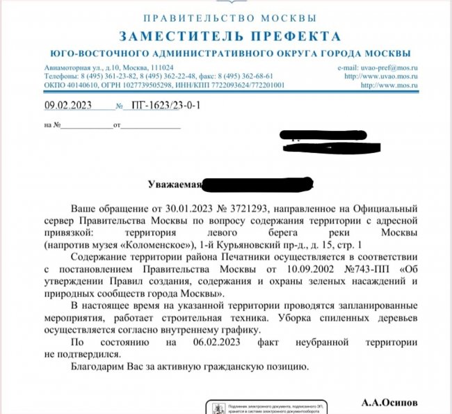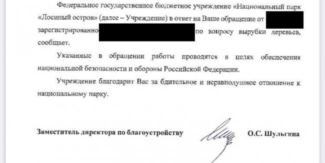 При этом государственные органы и ведомства хранят молчание. Москвичи отправили сотни писем с просьбой рассказать о причине вырубки столь огромного лесного массива, но не получили ни одного официального ответа по существу. Запросы отправляются «на орбиту» — так жители называют процесс, когда ведомства перенаправляют друг другу письма, не желая отвечать на вопросы. Получить хоть какой-то комментарий удалось Светлане Т. Она отправила в мэрию письмо с описанием нарушений и просьбой разъяснить характер работ. Ответ пришел из префектуры ЮВАО: «В настоящее время проводятся запланированные мероприятия, работает строительная техника. Уборка спиленных деревьев проводится согласно графику».