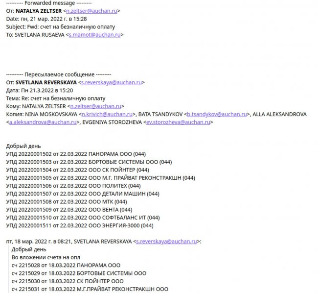 17 марта 2022 года в 14:50 контролер управления Наталья Зельцер просит в корпоративной бухгалтерии центрального офиса «Ашан» в Москве выставить счета на десять юридических лиц. 18 марта бухгалтер ЦО «Ашан» подтверждает выставленные счета. Все десять выбранных компаний выполняют заказы для госкомпаний или муниципальных учреждений.