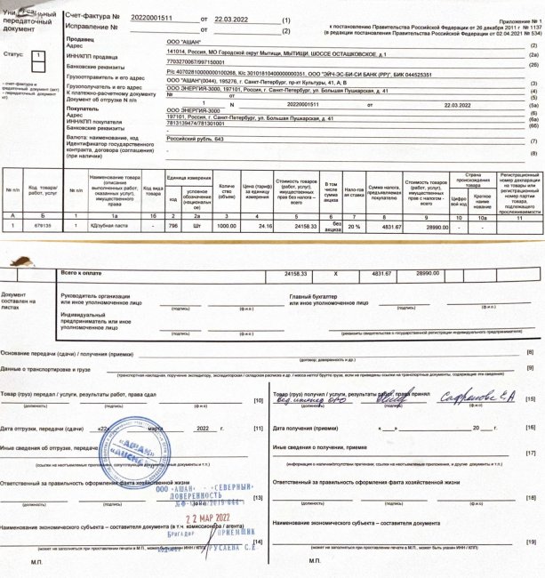Зубную пасту по этим документам должна забрать компания «Энергия-3000» (ИНН 7813139474). В 15:28 Зельцер оповещает сотрудника склада гипермаркета «Ашан Северный» Русаеву о том, что необходимо распечатать и подготовить УПД.