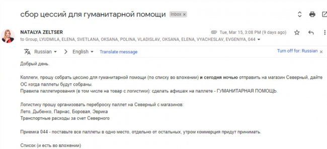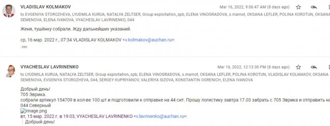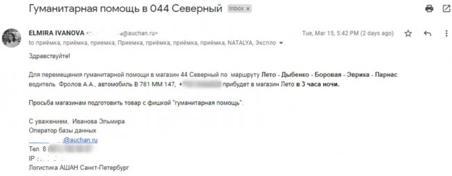 Отдел логистики в лице менеджера по складским операциям Дмитрия И. подтверждает собранное количество и автотранспорт, который ночью 16 марта доставит товары со склада и попутно заберет собранную «гуманитарную помощь» из магазинов «Ашан» Петербурга для перевозки в конечный пункт «Ашан Северный».