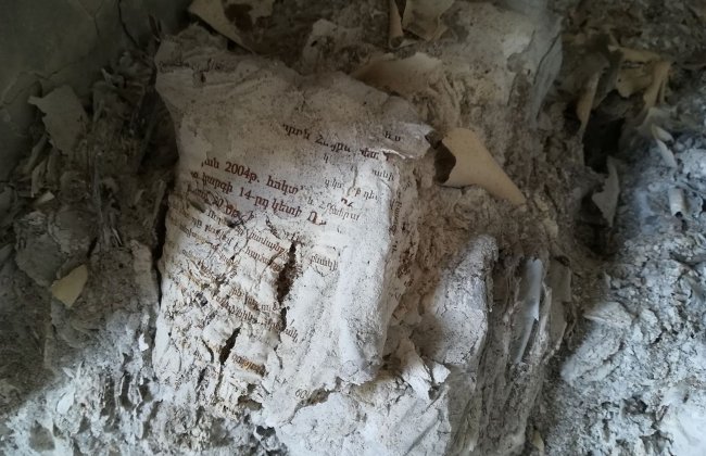 В Шелли-Ухтасаре новенькая школа с красной крышей, но в ней живут азербайджанские солдаты, и туда совсем нельзя. Зато никто не запрещает осмотреть сожженный дом напротив - как писали журналисты, работавшие с армянской стороны, многие армяне сжигали дома, чтобы те не достались азербайджанцам. Там тоже чувствуешь себя археологом: в куче пепла можно найти симпатичный чайный сервиз и турку. Предметы облеплены расплавленным стеклом, такой силы был жар. Замечаю раскрытую книгу - на сгоревших страницах еще можно рассмотреть армянские буквы. Но трогаешь рукой - и они исчезают, мельчайший пепел перемешивается.