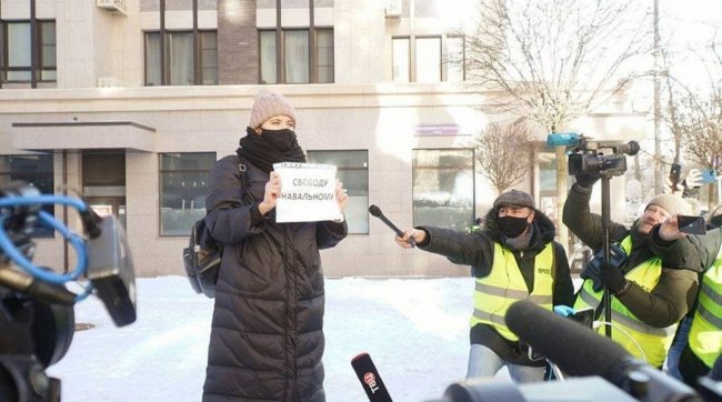 Девушку, стоявшую с плакатом "Свободу Навальному", быстро задержали.