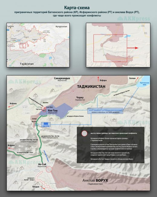 По версии таджикских силовиков, вооруженное столкновение спровоцировали кыргызские власти своими некорректными заявлениями. В конце марта на пресс-конференции председатель Госкомитета национальной безопасности Кыргызстана (ГКНБ) Камчыбек Ташиев заявил, что таджикам поступило предложение обменять анклав Ворух в Исфаринском районе Таджикистана на участок в Баткенской области Кыргызстана. Официальный Душанбе счел это высказывание угрожающим. Ташиеву напомнили, что в Таджикистане никогда не считали Ворух анклавом.